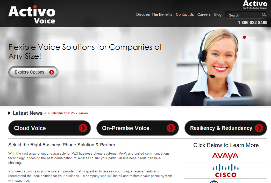 Voice.Activo.ca is our new, smaller site that is exclusively dedicated to our voice and phone offerings. You will find all of the information you need to make an educated decision about your company’s voice needs. We explain each of our voice services: Activo Cloud Voice, on-premise solutions, and resilient solutions. All of these options are detailed on our new site, and you’ll find that there is a lot of flexibility within each option.